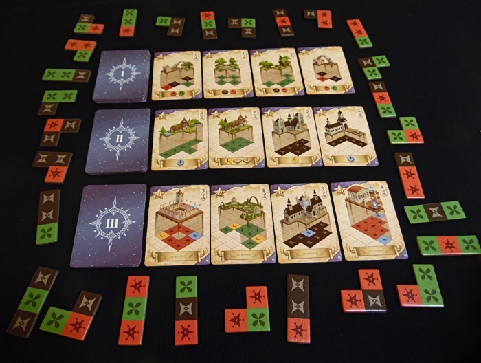 Dividiamo le carte per valore, tre mazzi si posizionano in colonna e per ognuna giriamo quattro carte, che ci rivelano via via costruzioni sempre più grandi e sontuose.