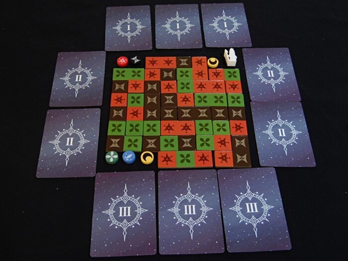Circondiamo l’offerta delle carte con le ventotto tessere runa grande e posizioniamo casualmente tra esse il meeple della regina, che ci guiderà segnando il punto di partenza.