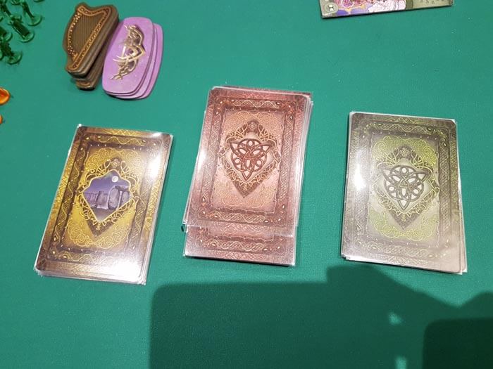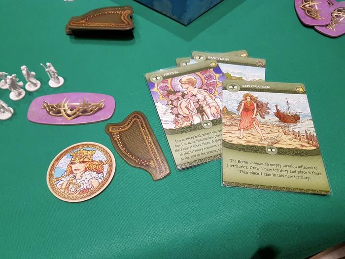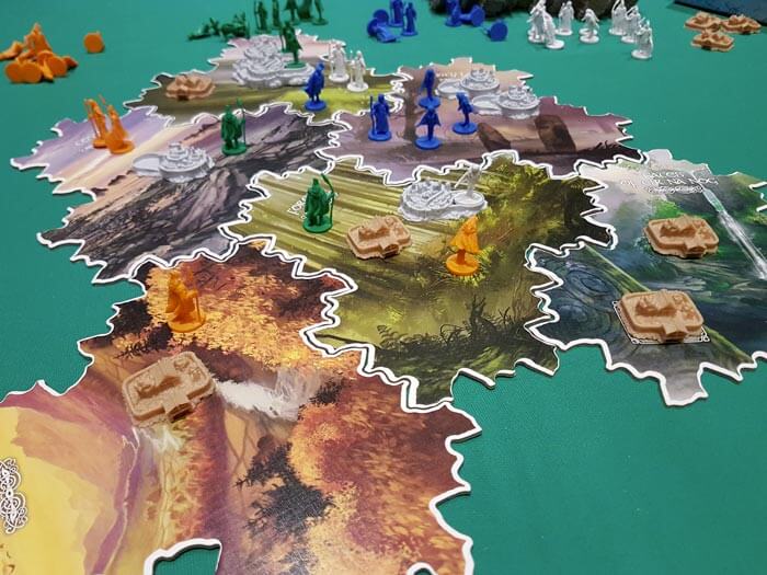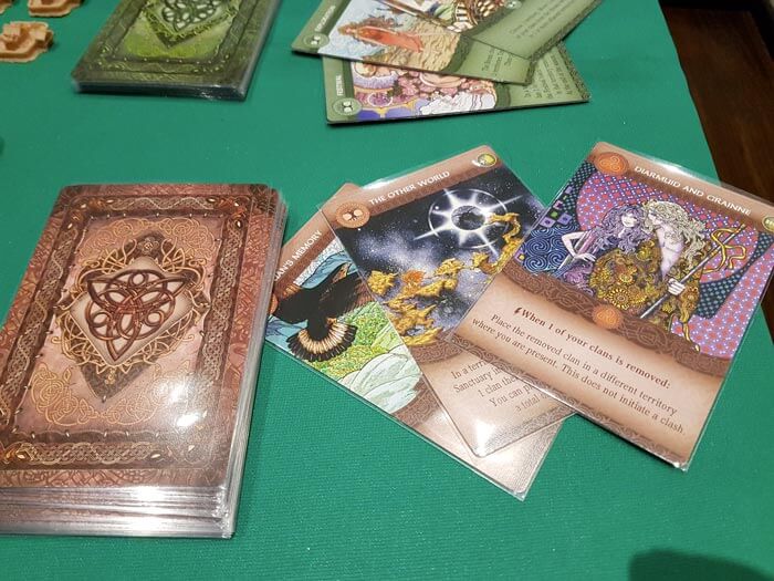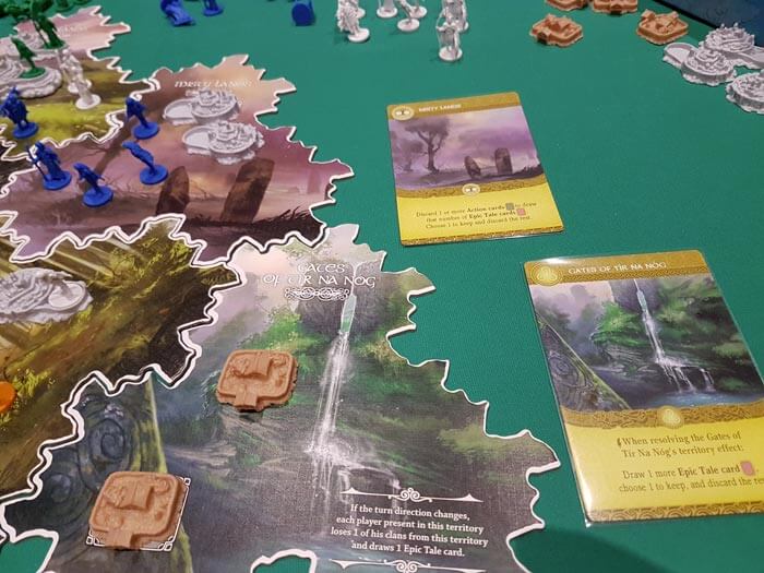 Oltre alle carte draftate a ogni turno, avere la maggioranza su una tiles territorio ci fornirà, la corrispondente carta del territorio (chiamata carta vantaggio), oppure attraverso varie azioni avremo accesso a un mazzo di carte “racconto epico” che potranno essere conservate da un turno all’altro a differenza delle precedenti.