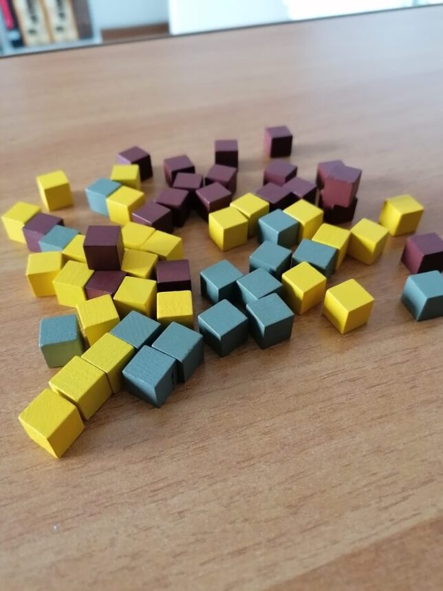 Dividiamo i cubetti merce per tipo e li poniamo sul tabellone negli appositi spazi, andando a formare così una riserva comune.