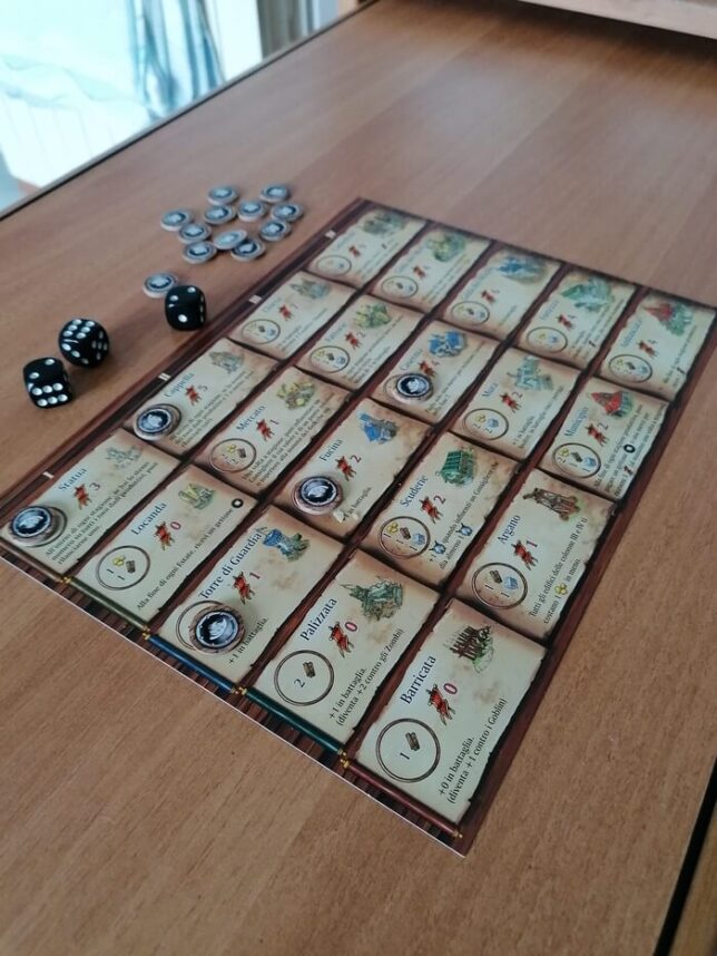 La presenza di dadi colorati fa la sua parte, per non parlare poi delle piccole scene di guerra raffigurate sulle carte.