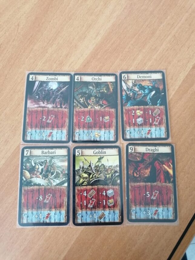 Successivamente dividiamo le carte invasori in base al numero sul dorso, formando così cinque mazzetti i quali verranno mischiati separatamente.