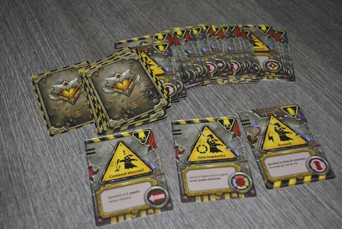 – DANNO SLOT: si eseguono subito le istruzioni sulla carta (tipo gira il tuo Mech di 90 gradi verso destra) E POI si lancia il dado a 6 facce per vedere in quale slot della linea di comando bisogna posizionarla. Se durante l’esecuzione della linea di comando quello slot è ancora danneggiato si eseguono ad ogni turno le istruzioni riportate sulla carta danno finché non ci si cura.