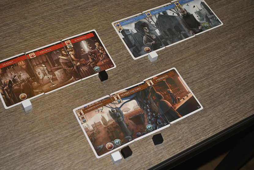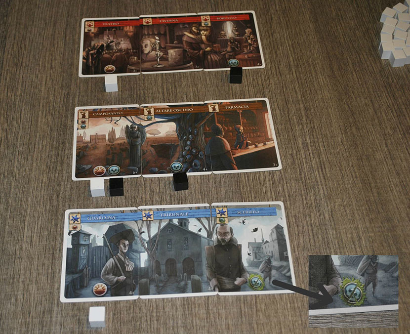 ” Il teatro, il camposanto e la guardina aggiungono ciascuno un cubo bianco speranza al distretto mentre il bordello, il camposanto e l’altare oscuro un cubo nero disperazione. Infine lo sceriffo grazie al suo simbolo può rimuovere un cubo nero disperazione da qualsiasi edificio di qualsiasi distretto
