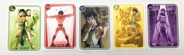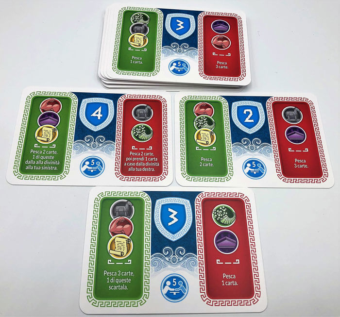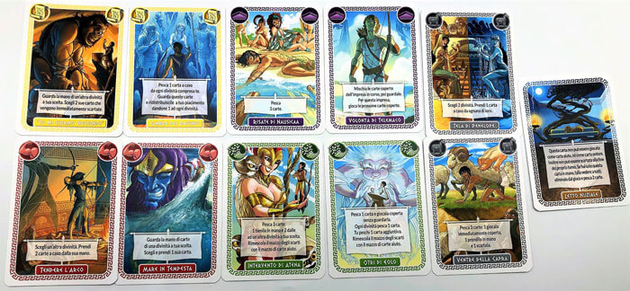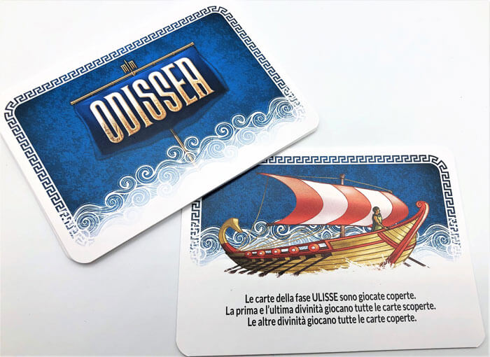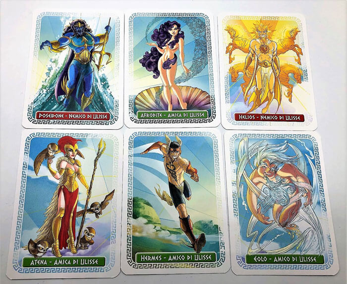 A questo punto ogni giocatore pesca una carta divinità tra quelle previste (a seconda del numero giocatori) e scopre così segretamente se sarà a favore o contro Ulisse. In 3 o 4 giocatori ci sarà solo una divinità contraria in 5 o 6 saranno 2.