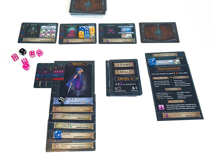 Il game designer ha prestato molta attenzione a come mettere “in tavola” il gioco, facendo sì che le carte, una volta sconfitte, possano essere impilate sotto la scheda del personaggio (facendone uscire solo una porzione) e, a seconda di come le si vuole usare (pozione, abilità o oggetto) è possibile posizionarle in modo tale che diventino parte integrante delle caratteristiche del nostro eroe, allungandone la lista delle abilità o aggiungendo simboli di caratteristiche.