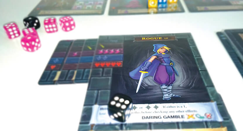 All’inizio del gioco si sceglie un personaggio (ognuno con una abilità speciale che permettere di ottenere in modi diversi uno o più dadi neri/jolly “usa e getta”, da poter usare durante la partita) e si crea un pool di dadi di colore e quantità pari alle statistiche del proprio eroe (giallo per la forza, rosa per l’agilità, blu per la magia).