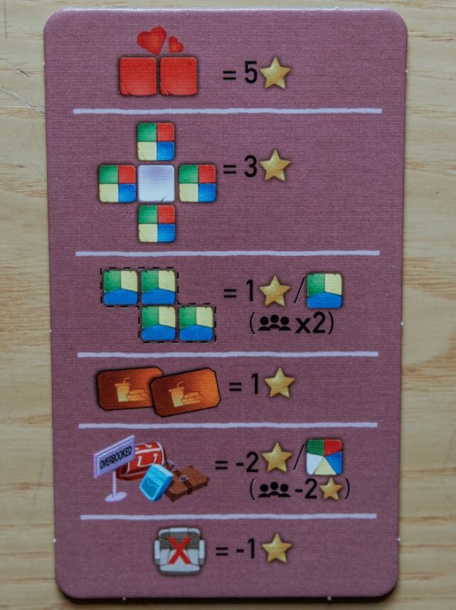 La metodologia di punteggio è riportata nella plancetta riassuntiva che si terrà affianco per tutta la partita. I punti vengono ottenuti in base all’adiacenza dei passeggeri presenti sui sedili della propria cabina d’aereo e sono considerati Adiacenti solo i sedili vicini in modo ortogonale. I sedili separati da un corridoio non sono considerati adiacenti.
