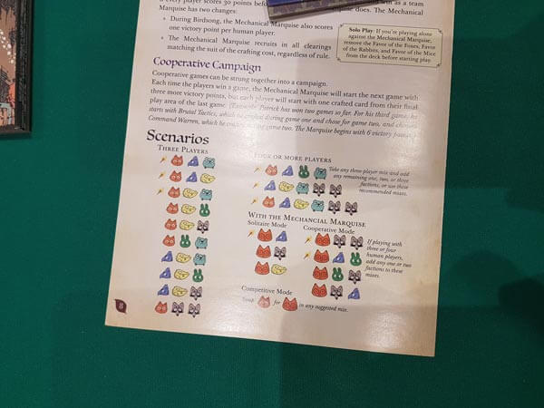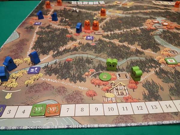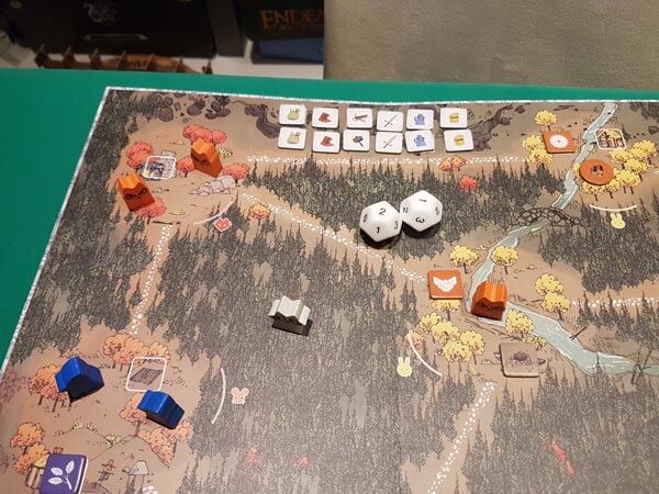 Abbiamo infatti una mappa del bosco con radure identificate da 3 simboli: topo, volpe e coniglio (scelta discutibile che crea inutile confusione con le fazioni con cui non hanno nulla a che vedere) corrispondenti ai semi delle carte.