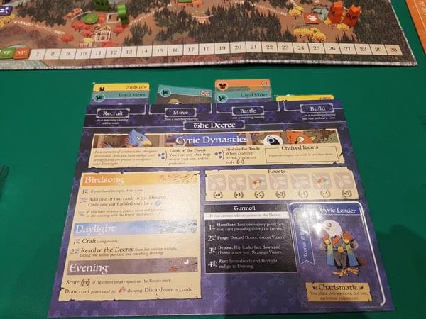 Per programmare un movimento da una radura coniglio, ad esempio, i falchi dovrenno inserire nella programmazione dell’azione movimento una carta coniglio o jolly, così come i gatti per produrre legno extra in una radura volpe avranno bisogno della corrispondente carta volpe.