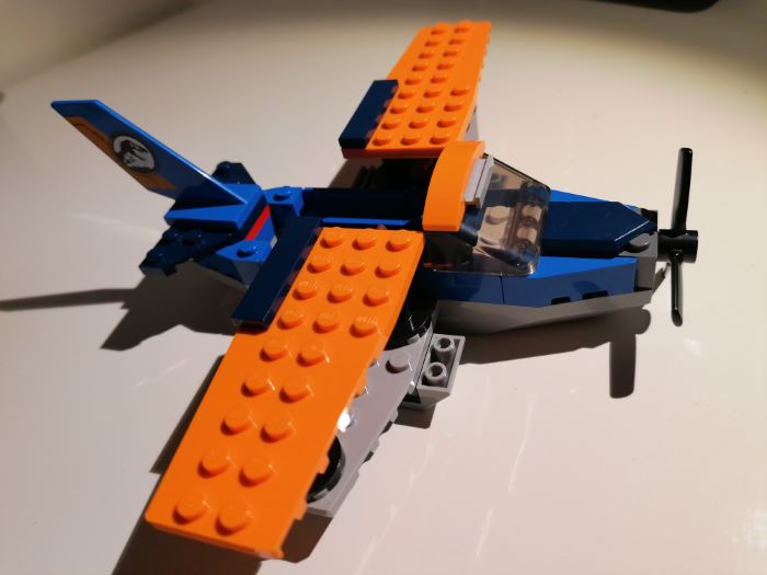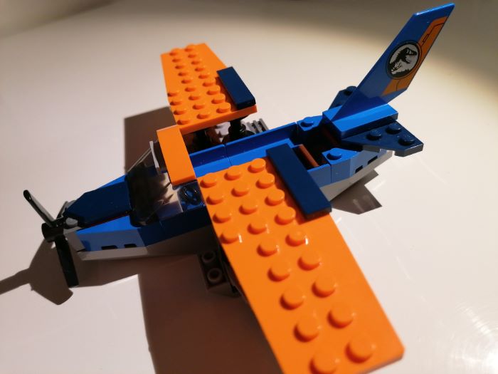 L’elica nera può ruotare, i colori sono sgargianti e ben combinati, e il velivolo presenta la possibilità di far sedere fino a due minifigures.