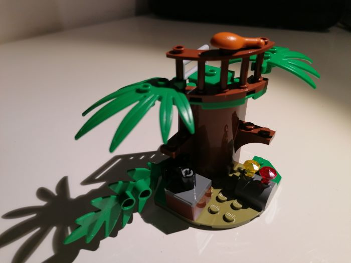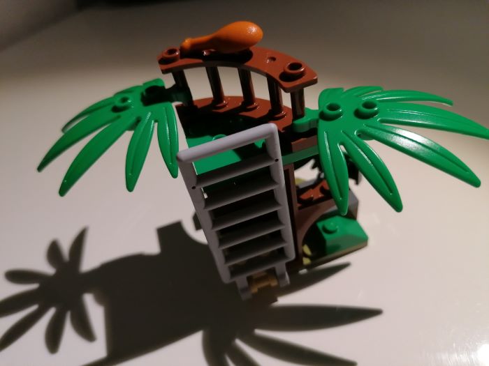 Il set contiene anche una postazione di vedetta sulla cima degli alberi dove è nascosto un tesoro. Questa struttura è assemblata attorno a un componente del tronco d’albero bruno-rossastro, con due fronde ai lati.