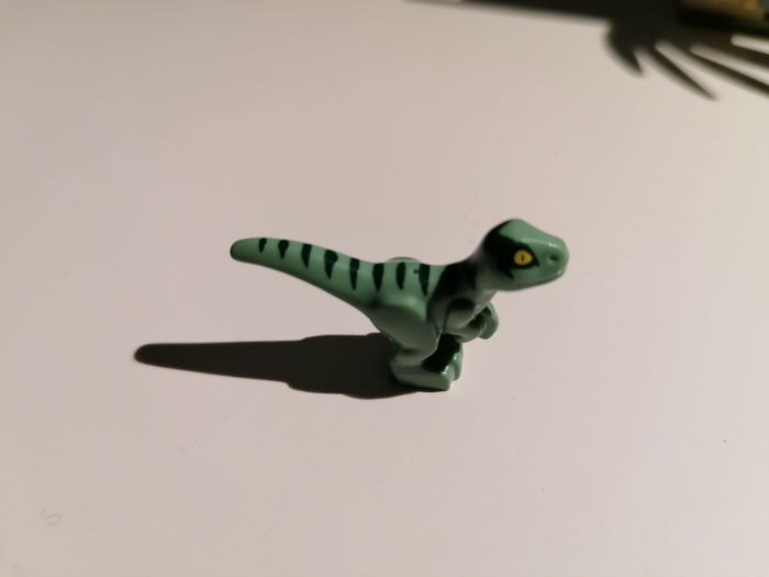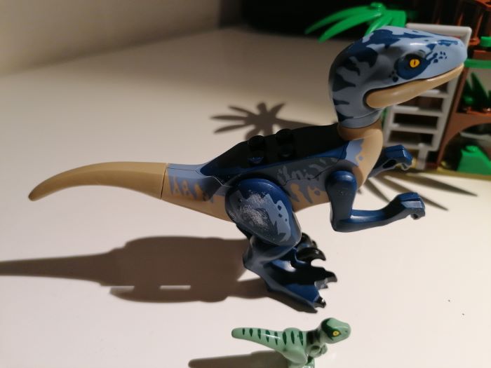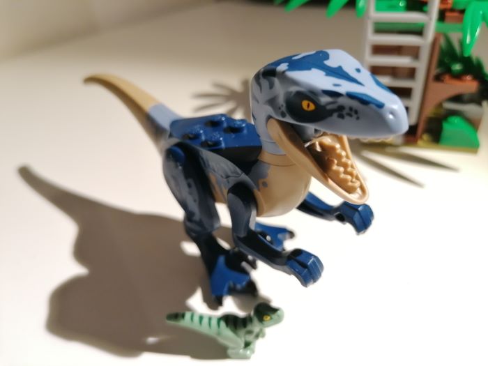 Un esclusivo Velociraptor accompagna le minifigure, composto da componenti marrone chiaro, blu scuro e blu sabbia, avrei preferito degli stacchi di colori meno netti (esempio tra la testa e il collo o tra la coda e il corpo) ma va bene anche così.