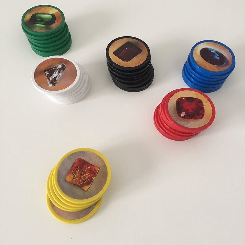 Il primissimo impatto lo danno sicuramente le fiches che rappresentano le 5 pietre preziose (più le fiches oro).Queste, in plastica e di una consistenza notevole, vanno a ricordare proprio le classiche fiches dei casinò: non stupitevi se vi ritroverete a giocherellarci distrattamente durante le varie partite.