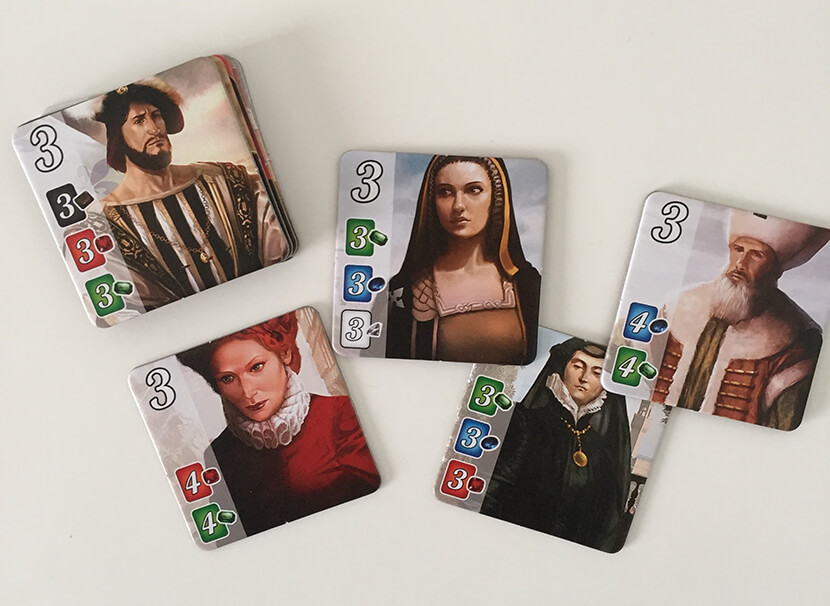 Inoltre, alla fine di ogni turno, se un giocatore avrà accumulato il giusto quantitativo di risorse di determinate tipologie riceverà la visita di uno dei nobili, che fornirà ulteriori, preziosissimi punti.