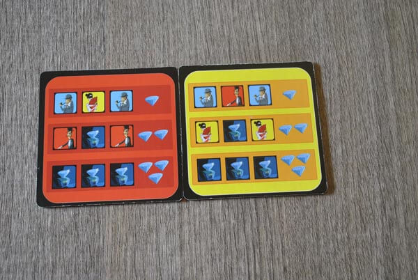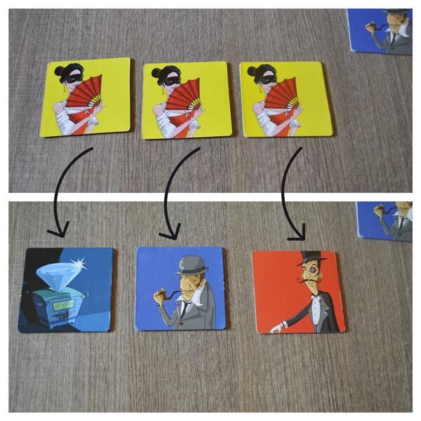 Ogni elemento è rappresentato in tutto 3 volte e sul dorso ha sempre un’immagine diversa ( le altre 3 figure rimaste). Ad esempio nel retro delle 3 tessere con Lady x in una ci sarà Lupin, nell’altra il diamante e nell’ultima rimasta la polzia.