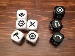 I dadi di Warhammer Shadespire sono dadi a sei facce costumizzati e presentano vari simboli, i dadi neri sono per la difesa e i bianchi sono per l’attacco.