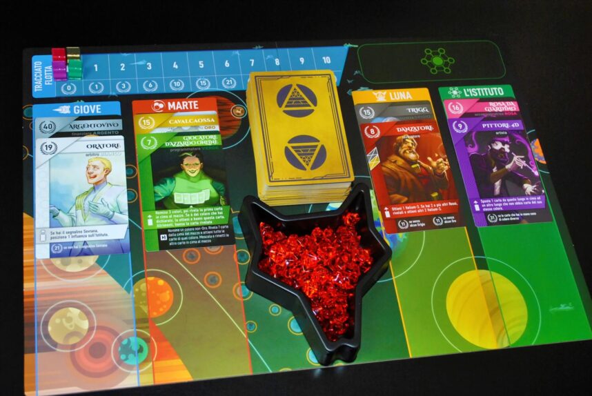 Nella parte centrale troviamo i 4 luoghi (Giove, Marte, Luna e L’istituto) dove alloggeranno le carte scoperte. Tra il secondo e il terzo luogo trovano spazio il mazzo di pesca e il contenitore porta Helium-3.