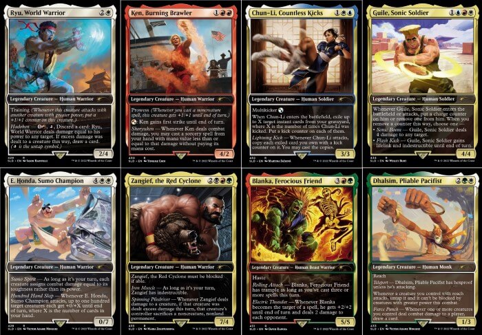 Continuano i crossover tra Magic the Gathering e gli altri marchi, questa volta tocca alla serie di Street Fighter. Le carte sono legali per i formati eterni, inoltre, come accaduto per le carte di Stranger Things, verranno ristampate in versione canonica nella future espansioni. Sono presenti otto personaggi provenienti dallo storico Street Fighter 2, che possiedono abilità nominali (come quelle di Forgotten Realms) ispirati alle tecniche del videogioco. Vediamo: