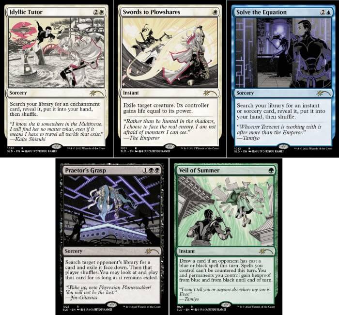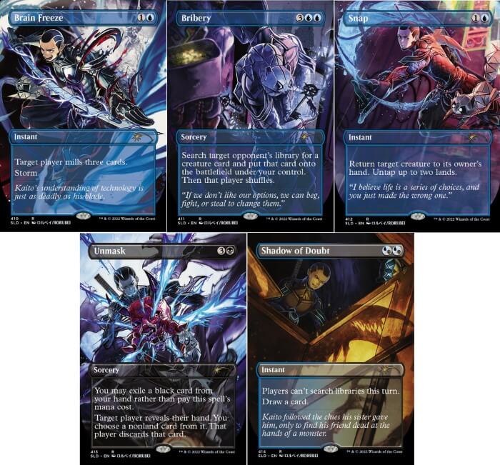 Realizzato dall’artista Rorubei, vediamo un mini-set composto da cinque carte che rappresentano le vicende del nuovo planeswalker Kaito Shizuki avvenute in Kamigawa: Dinastia Neon. Vediamo:
