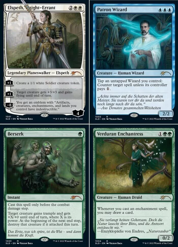 Il terzo e ultimo Artist Series è dedicato all’autore Volkan Baga, che lavora con la Wizards of the Coast dai tempi di Ondata Glaciale. Per la prima volta vediamo carte multilingua: i testi sono in lingua inglese, mentre i testi di colore sono in lingua tedesca (la lingua dell’autore). Le carte proposte sono le seguenti: