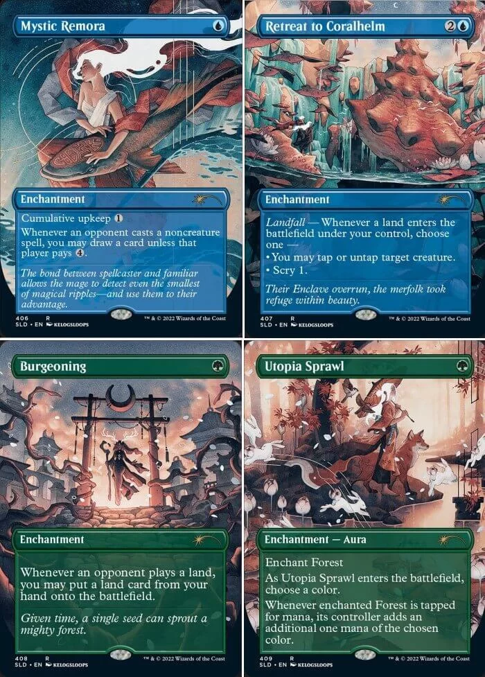 Le illustrazioni sono molto belle, indirettamente rievocano il piano di Kamigawa. Tuttavia, sono dell’idea che l’unica carta che valga davvero recuperare (anche singolarmente) sia Propagazione dell’Utopia, quindi lo consiglio solo ai collezionisti. Il prezzo del mini-set è di 29,99$ in versione classica e di 39,99$ in versione foil.