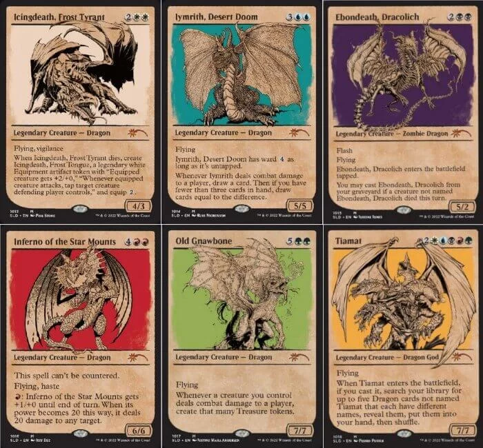 Inoltre, il 13 Giugno 2022 è stato rilasciato il Secret Lair Drop Series: Here Be Dragons che era disponibile solo nei negozi specializzati Beadle & Grimm’s (una compagnia ludica associata alla Wizards of the Coast). Essendo specializzati in Dungeons & Dragons, per omaggiare questa collaborazione sono stati proposti i maggiori draghi apparsi in Avventure nei Forgotten Realms in versione grafica “D&D 1.0”. Vediamo: Mortegelida, Tiranno del Gelo (compresa della pedina equipaggiamento Mortegelida, Lingua del Gelo), Iymrith, Sventura del Deserto, Morte d’Ebano, il Dracolich, Inferno dei Monti della Stella, Vecchia Mascella e Tiamat. Inoltre, nel box era possibile trovare anche: un porta deck, 100 foderine proteggi carte e uno stupendo conta-vita a forma di drago. Tutto molto bello, peccato che questo prodotto è andato esaurito in solo quattro ore! Insomma, adesso è solo una rarità che potete recuperare solamente tramite commercianti privati! Buona fortuna se siete collezionisti, mentre se siete giocatori competitivi potete trovare le carte in altri modi.