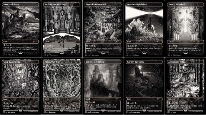 Vengono riproposte il ciclo delle terre Utility Lands del Blocco Innistrad. Le illustrazioni sono in bianco e nero per raffigurare la notte eterna apparsa in Innistrad: Caccia di Mezzanotte. Le carte in questione sono:
