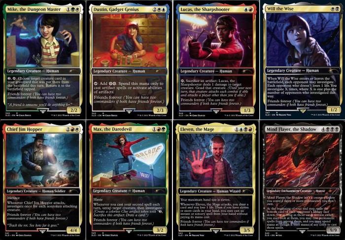 Siamo arrivati al punto forte dell’offerta, un mini-set atteso da mesi! Per la nuova serie Universes Beyond, la serie dove Magic incontra prodotti e realtà non appartenenti al mondo della Wizards of the Coast, vediamo il crossover con il telefilm Stranger Things. La novità è che le otto carte mostrate sono dei corrispettivi di altrettante carte che verranno rilasciate nell’espansione Streets of New Capenna. In poche parole: è un processo di ridenominazione come accaduto nell’espansione Godzilla Series Monster Cards. Inoltre, sette carte mostrano l’abilità Friends Forever, che è una ridenominazione dell’abilità Partner (possibilità di avere due Comandanti con questa abilità). Le carte in questione sono: