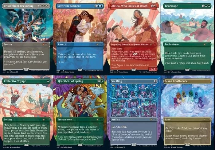 - Resa dei Conti Trionfante: reanimator di massa per il Commander, nell’illustrazione è presente Niko Aris (un planeswalker che si definisce non binario). La carta non trova spazio in competitivo;