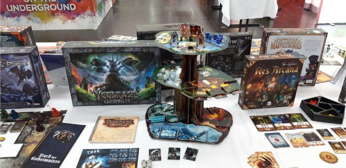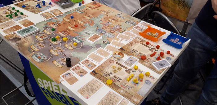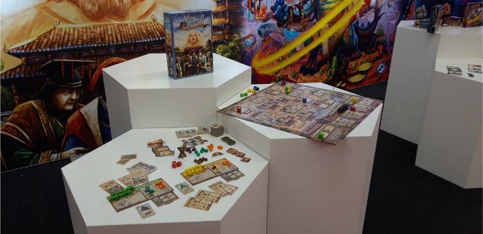 Veniamo ora al dunque: dopo la conferenza mi addentro nella sala riservata all’esposizione esclusiva delle novità e delle anteprime: una ottima illustrazione dei giochi, apparecchiati con dovizia in attesa di poterli giocare già dalla sera stessa (per chi ha avuto la fortuna di accaparrarsi un biglietto per la Game Night Preview, organizzata dallo stesso Merz Verlag GmbH che ha organizzato #SPIEL19). Con l’occasione si possono incontrare anche alcuni autori e scambiare quattro chiacchere con loro per farsi spiegare cosa la loro mente ha ideato.