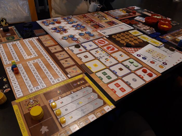 Di cosa si tratta? Beh, di servire il maggior numero di clienti al nostro ristorante, preparando i piatti tipici della cucina indonesiana (gli autori sono indonesiani, n.d.r.). Per fare questo abbiamo a disposizione 3 azioni nel nostro turno nei quali abbiamo la possibilità di migliorare le nostre abilità di cuoco, di acquistare gli ingredienti, e di recuperare monete al fine di pagare gli stipendi ai cuochi. Notare che tutte le risorse a fine del proprio turno, se non siete riusciti a soddisfare l’ordine andranno perdute, e vi beccherete 3 punti negativi per ogni ordine non evaso. Inoltre, ogni stipendio non pagato genera ulteriori 3 punti negativi per ogni moneta non retribuita…