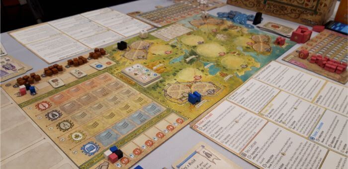 Hadara: Qualcuno lo paragona ad una “creatura” simile a 7 Wonders, e personalmente trovo che solo l’ambientazione lo richiama. Il meccanismo è completamente diverso, non c’è un draft, ma solamente una pesca di carte, dapprima da un mazzo coperto, nella 1° fase di gioco, e da un mazzo degli scarti, nella 2° fase. Alla fine di ogni turno abbiamo pertanto pescato 10 carte, di cui un certo numero le avremmo scartate per guadagnare soldi (altra piccola similitudine con 7 Wonders), mentre altre le avremmo posizionate sotto la nostra plancia. Tutto questo per tre turni pressoché identici, con una interazione molto ridotta, se non durante l’acquisto delle carte “scartate”. Gli passo la sufficienza se lo annoveriamo come gioco per neofiti oppure per famiglie per passare un’oretta in allegria alla sera… nulla di più per il sottoscritto (6/10).