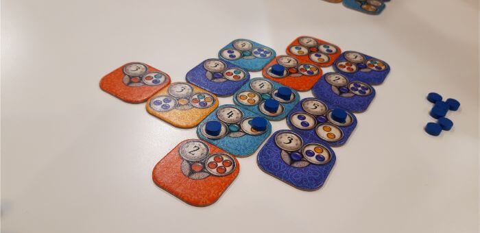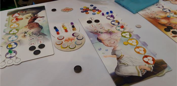 Nova Luna: Molto interesse per questo gioco di Rosenberg. Un bel mix tra Patchwork e Habitats, in cui dobbiamo prendere delle tessere da un percorso circolare ed avanzare con il medesimo meccanismo di Patchwork. Tali tessere hanno dei requisiti che se soddisfatti ci permettono di posizionare un gettone sulla tessera. Il gioco è un race game e chi finisce per primo i gettoni sarà il vincitore. Alla fine della prima partita ho notato che il vincitore ha scelto e posizionato le tessere in un ordine ben preciso, il che gli ha permesso di vincere con velocità ed un distacco notevole di gettoni sugli altri. Alla seconda partita ho adottato pure io la medesima tecnica con il risultato di una vittoria. Sembrerebbe pertanto un gioco mono strategico, ma mi rimetto ad ulteriori partite per giudicare meglio questa cosa. A primo acchito promuovo il gioco con una abbondante sufficienza, e lo indirizzo a giocatori di fascia medio bassa al pari di Hadara (6.5/10)