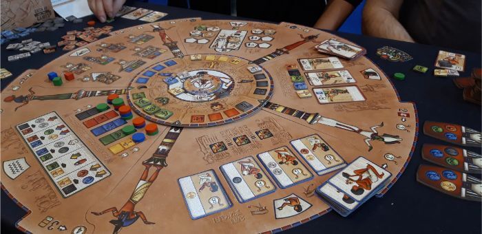 Pharaon: Per il sottoscritto sorpresa della fiera: un gestione/piazzamento risorse molto stretto, in cui dobbiamo cercare di rendere omaggio al defunto Faraone, dedicandogli la tomba più bella dell’antico Egitto. Una plancia circolare divisa in 5 settori in cui la tipologia di risorse necessarie per attivare l’azione cambia da turno a turno, in quanto la ruota centrale si sposta ogni turno. Ogni azione di uno spicchio ha bisogno di una determinata combinazione di colori di risorse affinché si possa attivare. Sulla ruota centrale si piazza la risorsa, mentre le rimanenti dovranno essere scartate dal singolo giocatore. Le azioni attivabili sono l’acquisto di tessere con vantaggi per i turni successivi, avanzamento sul tracciato sacro, lo scambio di materie, e guadagnare tasselli bonus one-shot. A fine partita poi c’è la valutazione dell’obelisco, che dove sottostare a due requisiti, che se soddisfatti forniranno ulteriori punti al giocatore
