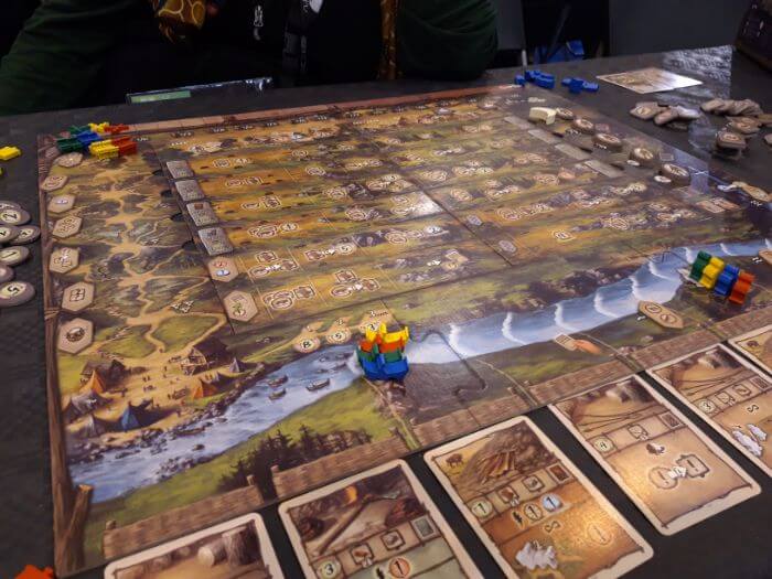 Vejen: se ne parlava abbastanza prima di Essen, e cosi lo cerco e lo provo. Piazzamento lavoratori e gestione risorse da 2/4 giocatori, ambientato nel 17° secolo, lungo la via del commercio tra Germania e Danimarca. In 12 turni i giocatori devono massimizzare le proprie risorse, tramite la costruzione di edifici e la vendita ai mercati. Si inizia mostrando un evento (uguale per tutti i giocatori) e ricevendo le entrate (punti movimento e risorse). Successivamente ha luogo la fase delle azioni in cui piazzando i propri lavoratori si possono eseguire 6 azioni diverse (acquistare, caricare, migliorare, vendere, costruire e attivare). Le azioni, bene o male, si svolgono come siamo abituati a vedere in altri giochi del genere, ma alcune hanno delle particolarità. Per esempio, l’introito della vendita delle risorse dipende sia dal prezzo di mercato, sia dalla distanza della città in cui si vuole vendere, il che rende tale azione leggermente diversa dal solito. Anche il caricare il “carretto” segue un po’un iter diverso dal solito… piccolezze che danno quel quid in più per un gioco che altrimenti sarebbe un film già visto. Peccato per il prezzo, che non giustifica quanto c’è nella scatola. Rimane comunque in wishlist. (7/10).