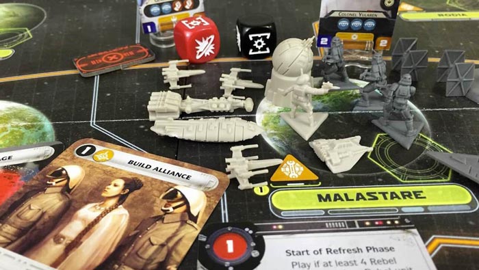 Questa variante prevede l’utilizzo frequente di un d6 (o di un d8, in base alle esigenze), per cercare di lasciare inalterata la sensazione di imprevedibilità di un avversario. Il dado viene utilizzato per decidere se l’Impero si oppone, o no, alle missioni ribelli, per reclutare un leader piuttosto che un altro in fase di ripristino, per stabilire quale sistema attivare o se innescare, o meno, determinate abilità.