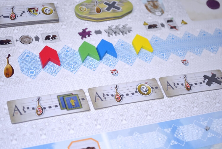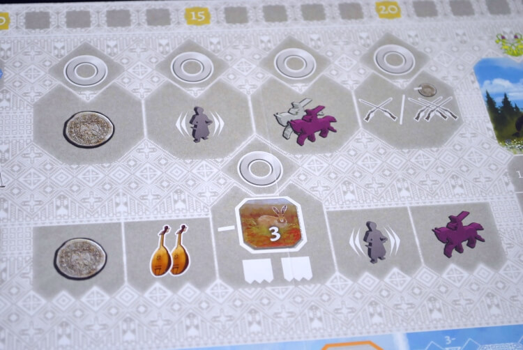 Per avanzare dovremo spendere una pelliccia del valore indicato e una volta spesa faremo scendere il nostro segnalino ed attiveremo una ricompensa a scelta tra quelle disponibili (quella scritta accanto o una delle precedenti).
