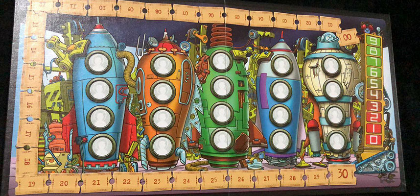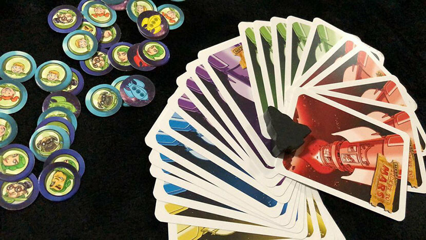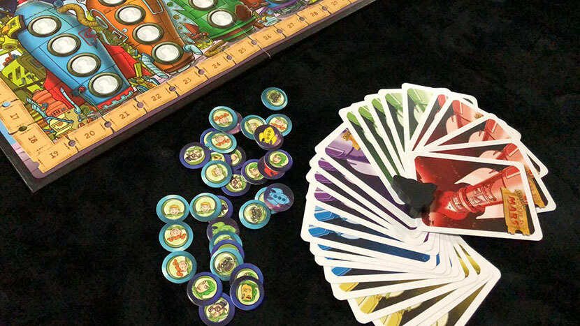 Le carte che propone il gioco sono di due tipi. Abbiamo le carte obiettivo (i giocatori ne pescheranno 3, una per tipo, ad inizio partita) e le carte azione. Sulle carte obiettivo sarà segnato il numero di punti che si guadagneranno se si porterà a termine il compito indicato e ovviamente il numero o la tipologia di partecipanti ad una spedizione su Marte. Una tipologia di carta obiettivo riguarda una coppia precisa di individui presenti all’interno di un navicella, una seconda indica invece il numero di personaggi dello stesso tipo che devono essere ospitati all’interno di un razzo, mentre l’ultima tipologia riguarda una maggioranza di terrestri su un razzo oppure un esatto numero di partecipanti ad una spedizione. Le carte azione invece indicheranno il posizionamento di un determinato personaggio all’interno di un qualunque posto disponibile su uno dei razzi sulla plancia, lo spostamento di un passeggero già accomodato da un razzo all’altro oppure la discesa di un terrestre che pensava di essere già in salvo, ma che dovrà invece scendere a terra in attesa di essere, eventualmente riammesso in un secondo tempo. Utilissima anche la carta speciale che non solo farà scendere di una tacca il segnatempo, accorciando quindi le possibilità di soddisfare le proprie carte obiettivo in vista della fine della partita, ma anche l’opportunità di recuperare tutte le carte azione giocate fino a quel momento, visto che, una volta messe davanti a sé non potranno essere altrimenti recuperate.