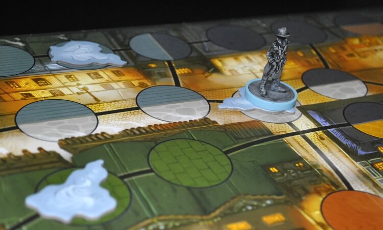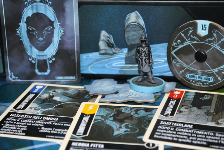 Gli effetti delle sue carte permetteranno a lui di spostare quei segnalini. Il loro scopo e quello di aumentare la difesa se l’uomo invisibile si trova sopra ad essa durante un’attacco, danneggiare gli avversari se si trovano sopra di esse giocando determinate carte ma soprattutto passare da nebbia a nebbia durante il movimento per sfuggire e raggiungere ogni parte di mappa il più velocemente possibile.