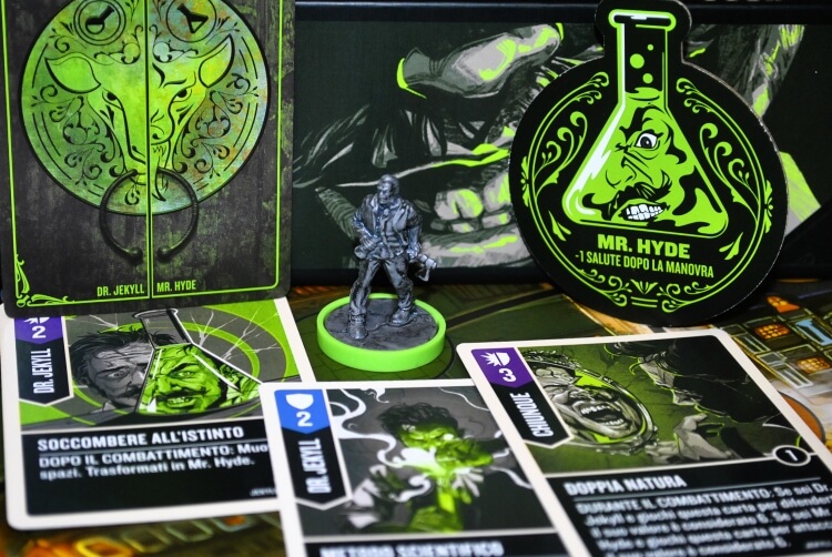 Il Dott. Jekyll sarà più abile nella difesa mentre Mr. Hide nell’attacco. Non potremo però cambiare “forma” quando ci fa più comodo ma solo all’inizio del nostro turno o grazie all’effetto di determinate carte.